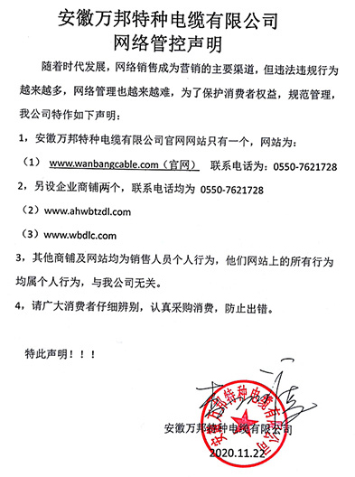 鄭重聲明:安徽萬邦特種電纜有限公司官方網站為:www_wanbangcable_com.mingjindsd.cn,除此之外無任何子網站或合作網站,其余均為假冒偽劣。電話:0550-7621728 13485756353 地 址:安徽省天長市滁州高新技術產業開發區經四路29號